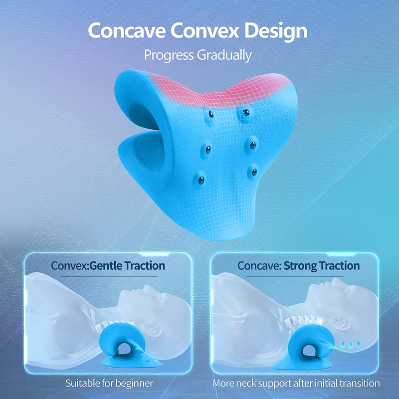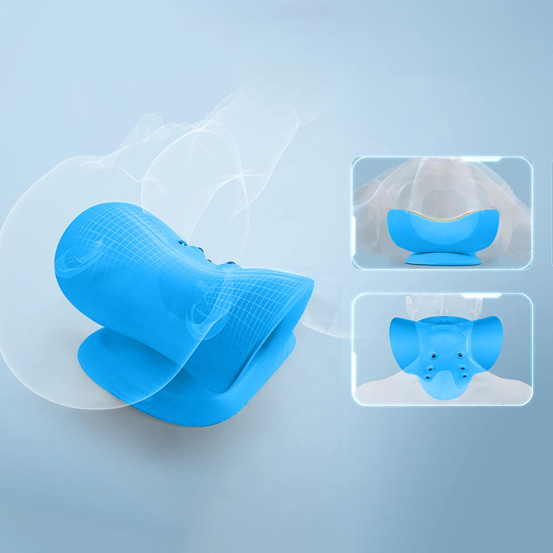 The C-shaped cervical traction device is ergonomically designed to match the human cervical spine, offering vertical and horizontal support.