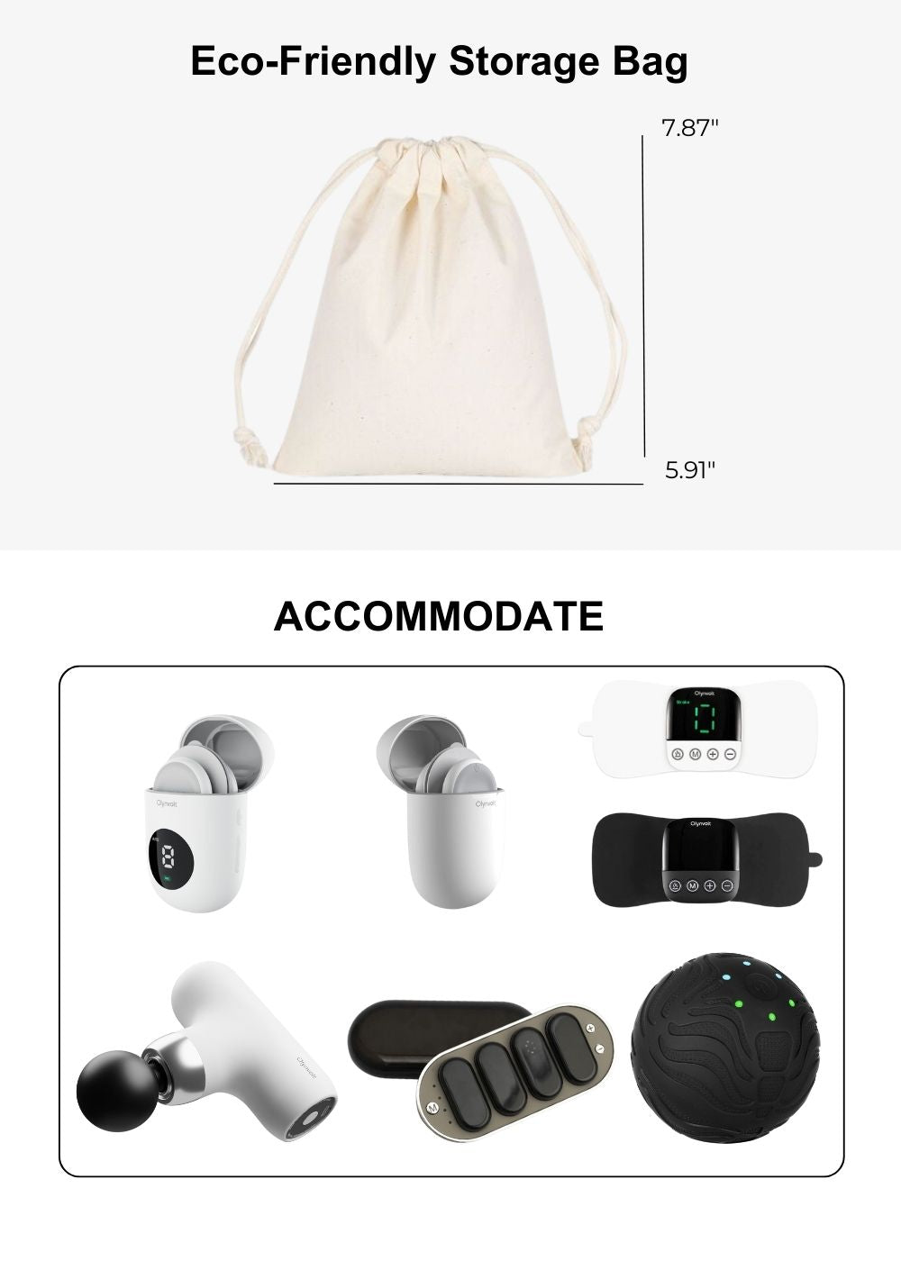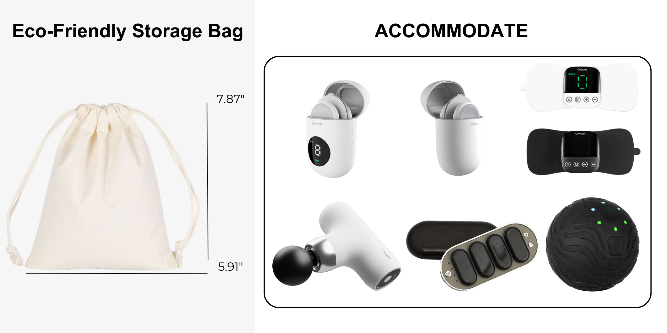 Spacious & Durable: Store your Olynvolt essentials, from Pocket Pro and Pocket to our Massage Gun and Quadwave Pro, in this eco-friendly bag designed for durability.